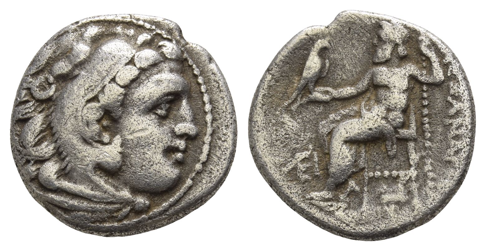 Head of Herakles to right, wearing lion skin headdress, paws tied beneath chin / ΑΛΕΞΑΝΔΡΟΥ, Zeus seated to left on backless throne, right leg drawn back, his feet resting on low foot rest, holding long sceptre in his left hand and, in his right, eagle standing to right with closed wings; ΛΕΙ (partially ligate) in left field and monogram of TI beneath throne. Price 1783. 4.08gr, 17mm, 12h.