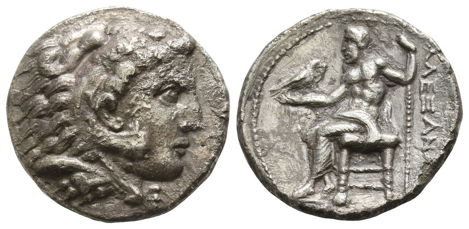 Head of Herakles to right, wearing lion skin headdress, paws tied beneath chin / ΑΛΕΞΑΝ[ΔΡΟΥ], Zeus seated to left on backless throne, right leg drawn back, his feet resting on low foot rest, holding long sceptre in his left hand and, in his right, eagle standing to right with closed wings; -|O (Phoenician 'K [= 'Ozmilk]) and ||| ||| – = (date [36 in Phoenician]) in left field. Price 3292 (Ake); DCA2 938. 15.35gr, 27mm, 6h.