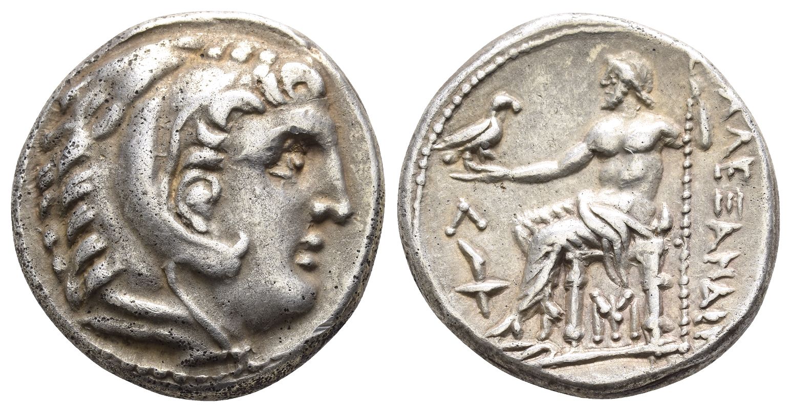 Head of Herakles to right, wearing lion skin headdress, paws tied beneath chin / ΑΛΕΞΑΝΔΡΟΥ, Zeus seated to left on backless throne, right leg drawn back, his feet resting on low foot rest, holding long sceptre in his left hand and, in his right, eagle standing to right with closed wings; in left field, Λ above torch; monogram of MI beneath throne. Price 456; Ehrhardt 34. 17.07gr, 26mm, 7h.