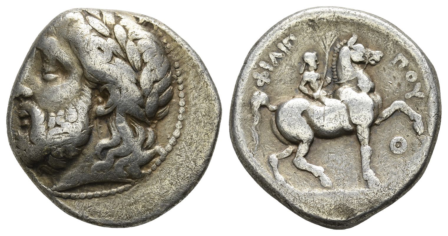 Pella mint; struck circa 323-315 BC. Posthumous Issue. Laureate head of Zeus to left / ΦIΛIΠ-ΠOY, horseman riding to right, holding palm branch and bridle; beneath horse's foreleg, Θ. SNG ANS 430; SNG Alpha Bank 275; Le Rider 439. 13.75gr, 25mm, 7h.