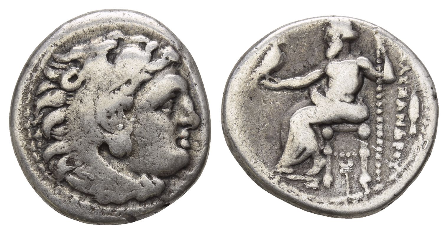 'Kolophon' mint; struck under Menander or Kleitos, circa 323-319 BC. In the name and types of Alexander III of Macedon. Head of Herakles to right, wearing lion skin headdress, paws tied beneath chin / ΑΛΕΞΑΝΔΡΟΥ, Zeus seated to left on backless throne, left leg drawn back, his feet resting on a low foot rest, holding long sceptre in his left hand and, in his right, eagle standing to right with closed wings; kerykeion beneath throne, spearhead in outer right field. Price 1756; Müller 208. 3.98gr, 17mm, 3h
