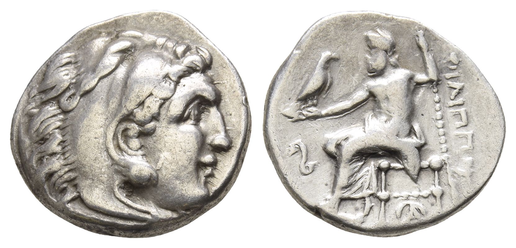 Head of Herakles to right, wearing lion skin headdress, paws tied beneath chin / ΦΙΛΙΠΠΟΥ, Zeus seated to left on backless throne, right leg drawn back, his feet resting on low foot rest, holding long sceptre in his left hand and, in his right, eagle standing to right with closed wings; in left field, buckle to left; beneath throne, crescent above A. Price P15; ADM II Series IX. 4.16gr, 17mm, 12h.