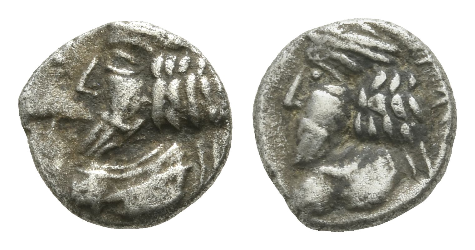 Istakhr (Persepolis) mint. Diademed bust to left / Diademed bust to left. Cf. Van't Haaff, Persis, Type 590. 0.57gr, 8mm, 9h.