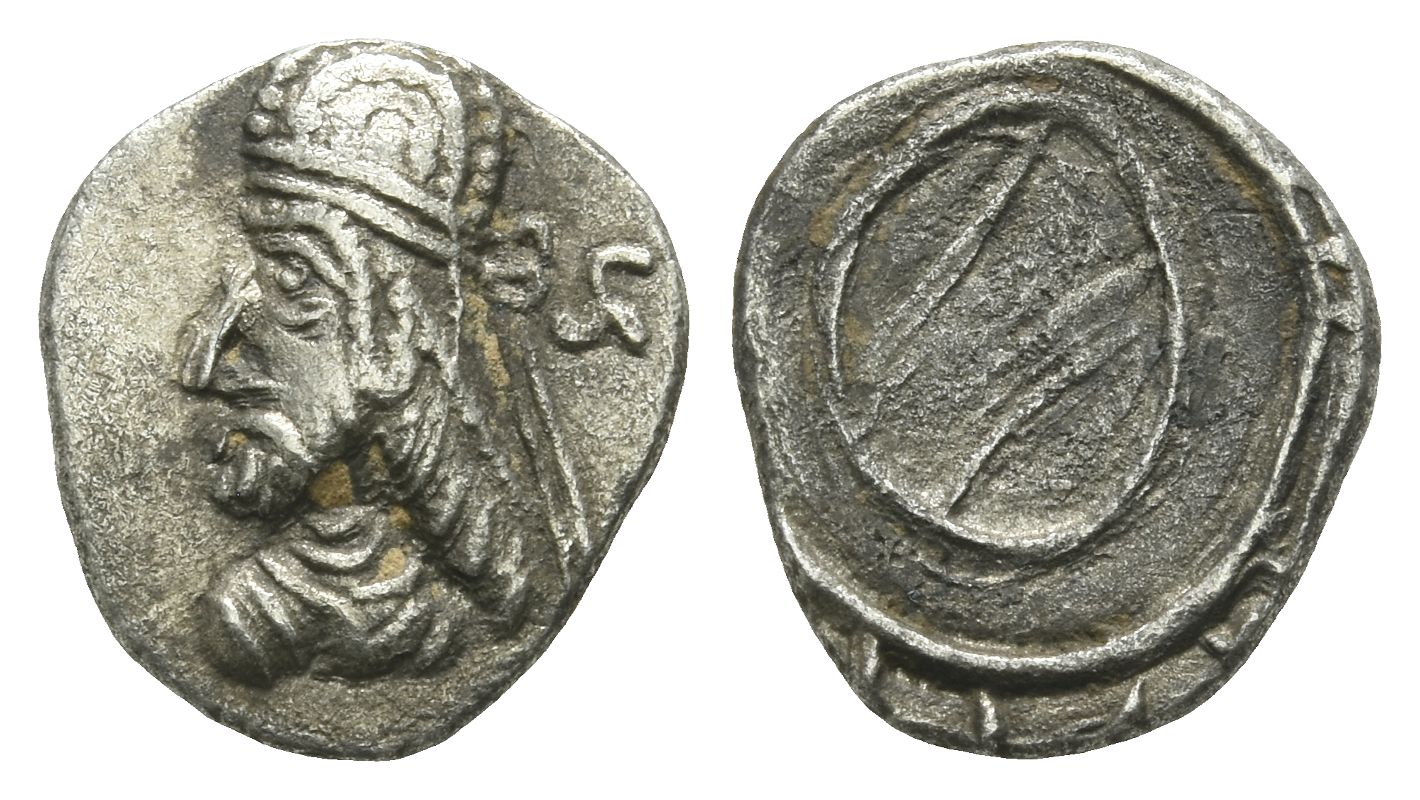 Bearded bust to left, wearing diadem and Parthian-style tiara with two rows of pellets around pellet-in-crescent; triskeles behind / Diadem with no ties. Cf. K&M 4/59 (“Fürst Y”); cf. Tyler-Smith, Parcel type 1, 216 (obol; diadem with ties); Alram 619 var. (diadem with ties); Sunrise -. 1,31gr, 14mm.