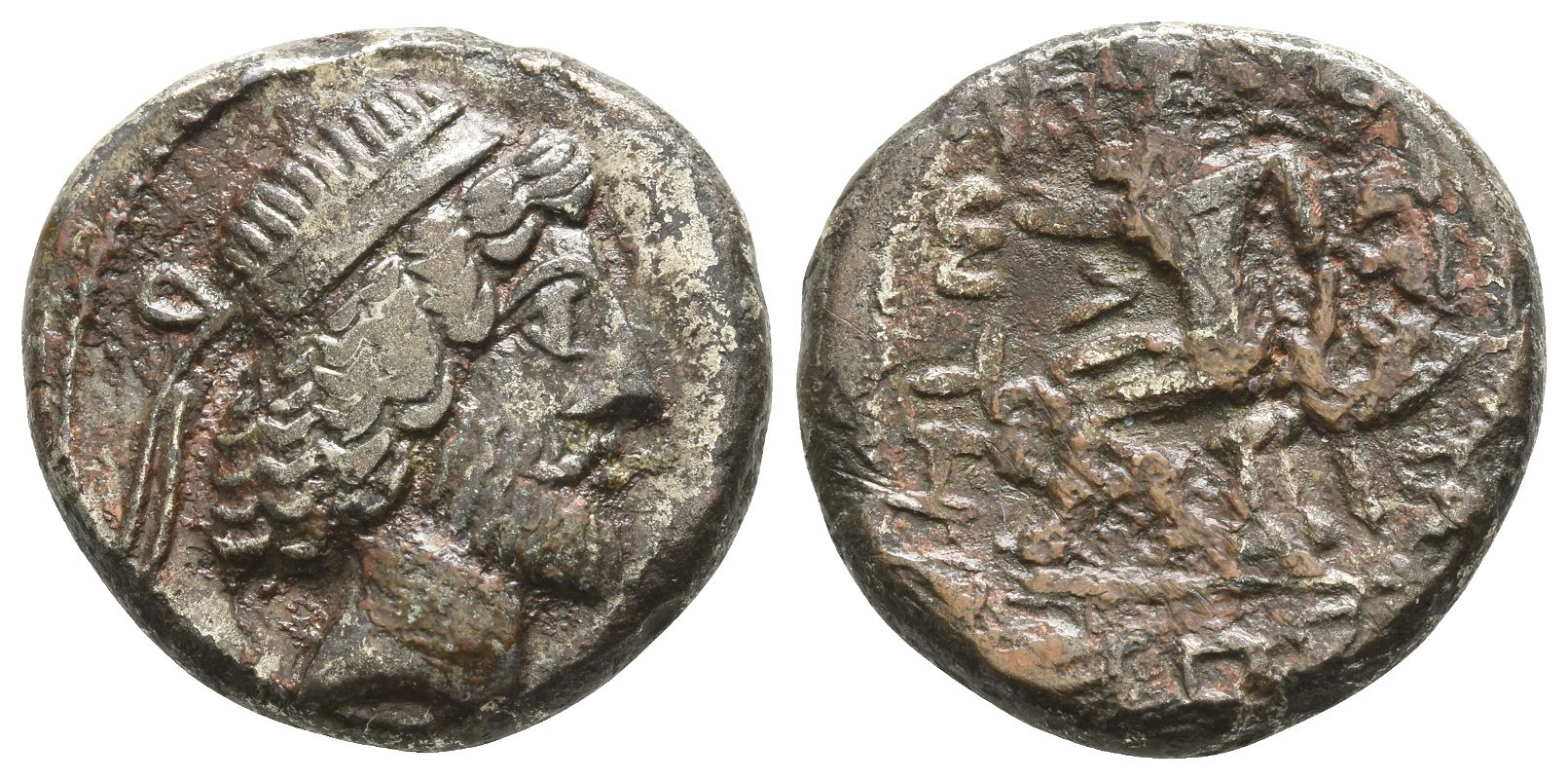Diademed head to right / Herakles seated to left on rock, holding club; monogram above arm, letter beneath arm; TOB(?) (date) in exergue. Alram -; BMC 6 (listed as Attambelos III); DCA 490 (same). 14.46gr, 26mm, 12h.