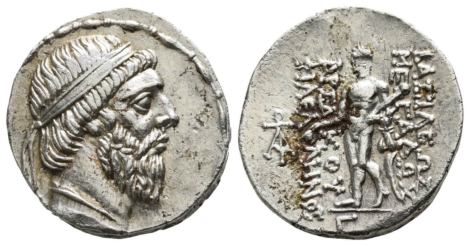Diademed and draped bust of Mithradates I to right / BAΣIΛEΩΣ ME-ΓAΛOY APΣA-KOY ΦIΛEΛ-ΛHNOΣ, Herakles standing to left, holding skyphos in his right hand and club and lion skin in his left; monogram of APT in outer left field; Γ[ΟΡ] (date) in exergue. Sellwood 13.3; Shore 36; Sunrise 261. 15.57gr, 27mm, 12h.
