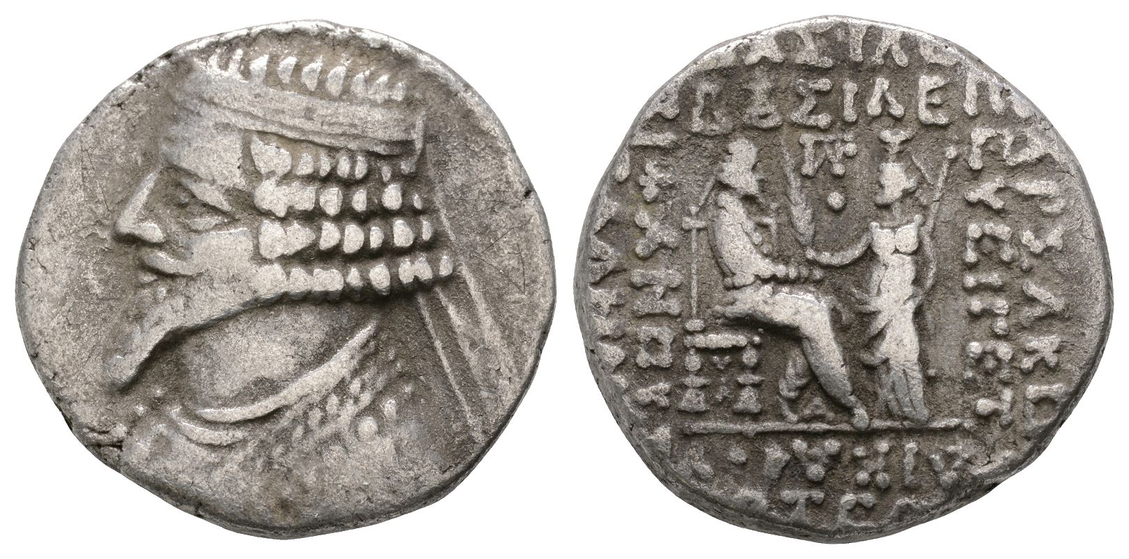 Seleukeia on the Tigris mint. Dated Artemisios (April) of uncertain year. Diademed and draped bust to left, with pointed beard / ΒΑΣΙΛΕ[ΩΣ] ΒΑΣΙΛΕΩΝ above, ΑΡΣΑΚΟ[Y] EYEPΓET[OY] to right, ΔΙΚΑΙΟY and [A]PTEM (date) below, [Ε]ΠΙΦΑΝΟYΣ [ΦΙΛ]ΕΛΛΗΝ[ΟΣ] to left, Mithradates seated to right on throne, receiving palm frond from Tyche standing to left, who holds sceptre with left hand; above extended Tyche's arm ΠΛΡ monogram above pellet; V•A beneath throne; A between Mithradates' feet. Sellwood 55.11 (Tiridates); Sunrise -; Shore 311 (same); Callataÿ, Tétradrachmes 108 (Phraates IV). 10.12gr, 26mm, 12h