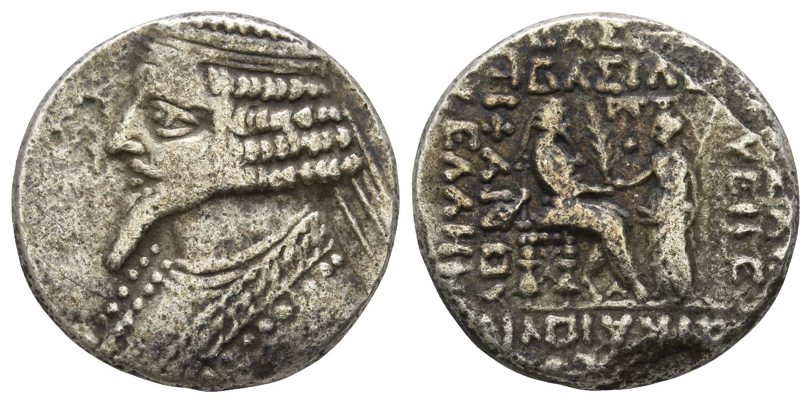 Seleukeia on the Tigris, dated Artemisios (April) of an uncertain year. Diademed and draped bust to left, with pointed beard / ΒΑΣΙΛΕΩΣ ΒΑΣΙΛΕΩΝ ΑΡΣΑΚΟY EYEPΓETOY ΔΙΚΑΙΟY ΕΠΙΦΑΝΟYΣ ΦΙΛΕΛΛΗΝΟΣ ΑΡΤΕM, Mithradates enthroned to right, receiving palm frond from Tyche standing to left, and holding sceptre with left hand; above Tyche's arm monogram of ΠΛP above pellet; beneath throne, V/A; between Mithradates' feet, A. Sellwood 55.11 var. (no pellet); Callataÿ, Tétradrachmes 108 (Phraates IV). 10.70gr, 26mm, 12h