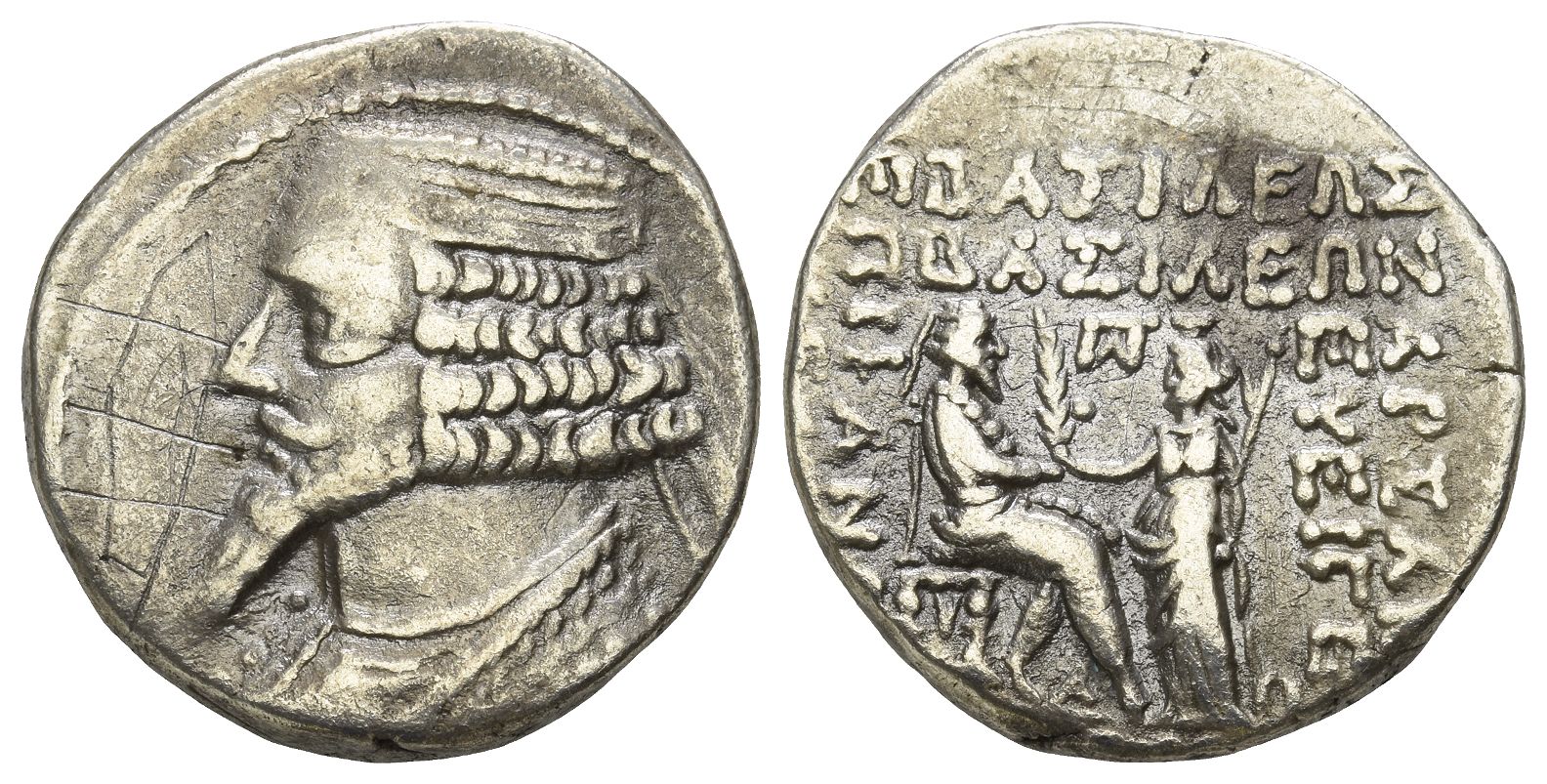 Seleukeia on the Tigris, uncertain year and month. Diademed and draped bust to left, with pointed beard / ΒΑΣΙΛΕΩΣ ΒΑΣΙΛΕΩΝ ΑΡΣΑΚΟY EYEPΓETOY ΔΙΚΑΙΟY ΕΠΙΦΑΝΟYΣ ΦΙΛΕΛΛΗΝΟΣ ΑΡΤΕ, Mithradates enthroned to right, receiving palm frond from Tyche standing to left, and holding sceptre with left hand; above Tyche's arm monogram of ΠΛP above pellet; beneath throne, V/A; between Mithradates' feet, A. Cf. Sellwood 55.11-14 (no pellet). 10.80gr, 26mm, 12h