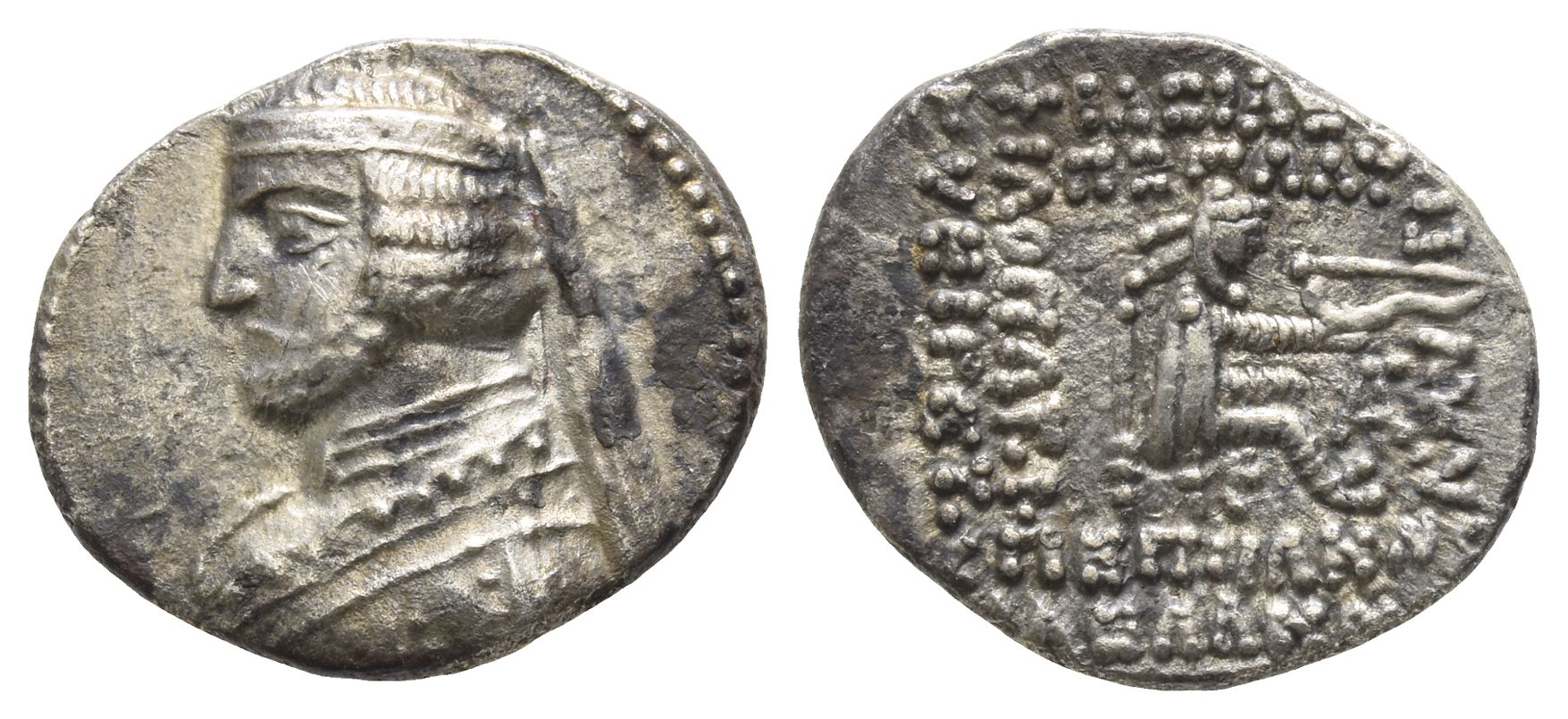Diademed bust to left, wearing necklet with medallion / ΒΑΣΙΛΕΩΣ ΜΕΓΑΛΟΥ ΑΡΣΑΚΟΥ ΕΠΙΦΑΝΟΥΣ ΦΙΛΕΛΛΗΝΟΣ ΦΙΛΟΠΑΤΟΡΟΣ ΕΥΕΡΓΕΤΟΥ, Archer (Arsakes I) seated to right on throne, holding bow; ΑΓ monogram beneath bow. Sellwood 36.7 (Darius?) var. (T behind throne); Sunrise 318; Shore 153. 3,91gr, 19mm, 12h.