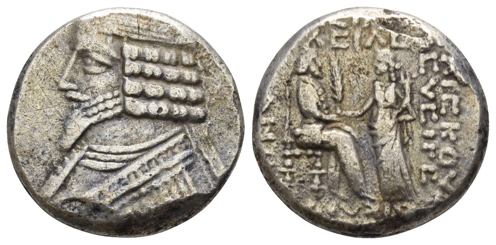 Seleukeia on the Tigris mint. Uncertain month and SE year. Diademed and draped bust to left, with pointed beard / ΒΑΣΙΛΕΩΣ ΒΑΣΙΛΕΩΝ ΑΡΣΑΚΟY ΕYΕΡΓΕΤΟY ΔΙΚΑΙΟY ΕΠΙΦΑΝΟYΣ ΦΙΛΕΛΛΗΝΟΣ, Phraates seated to right on throne, receiving palm frond from Tyche standing to left, who holds cornucopia with left hand; year and month in exergue. Cf. Sellwood 51.1-8; cf. Sunrise 390; cf. Shore 272. 11.21gr, 25mm, 12h