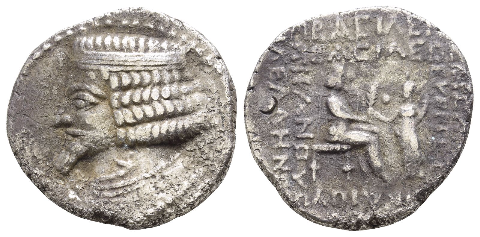 Diademed and draped bust to left / BAΣIΛEΩC BAΣIΛEΩN APΣAKOY EYEPΓETOY ΔIKAIOY EΠIΦANOYΣ ΦIΛEΛΛHNOΣ, Phraates seated to right on throne, receiving palm from Tyche standing to right, holding cornucopia, pellet between; uncertain date in exergue. Cf. Sellwood 51.43; cf. Callataÿ, Tétradrachmes 224. 9.20gr, 28mm, 1h.