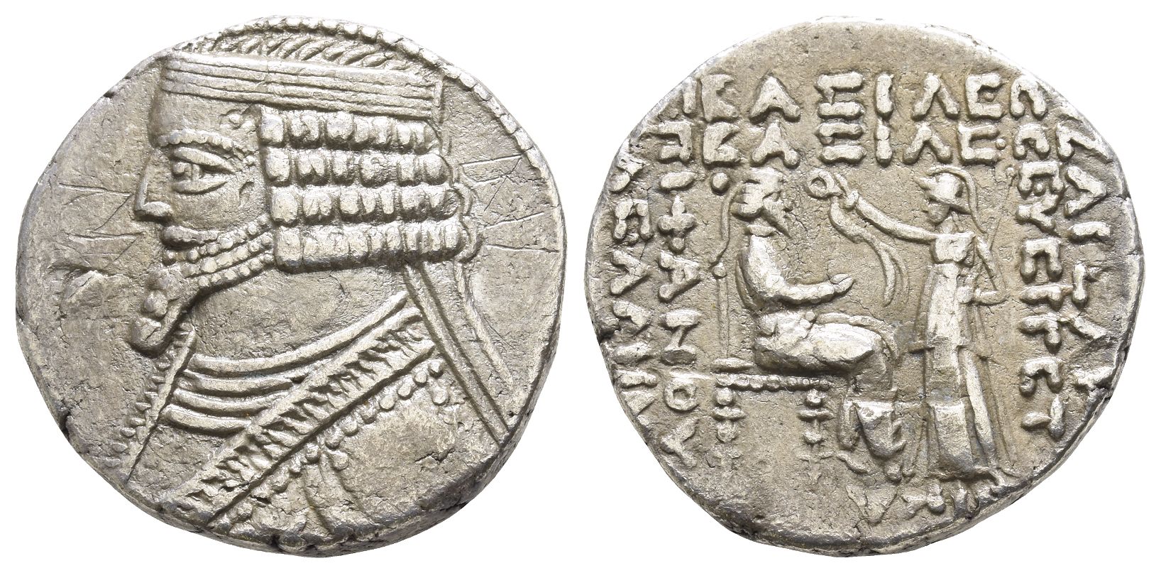 Diademed and draped bust to left / BAΣIΛEΩC BAΣIΛEΩN APΣAKOY EYEPΓETOY ΔIKAIOY EΠIΦANOYΣ ΦIΛEΛΛHNOΣ, Phraates seated to right on throne, Athena standing to left before him, presenting diadem and holding spear; [date in exergue]. Cf. Sellwood 52; cf. Sunrise 391; cf. Shore 274. 10.48gr, 27mm, 12h.
