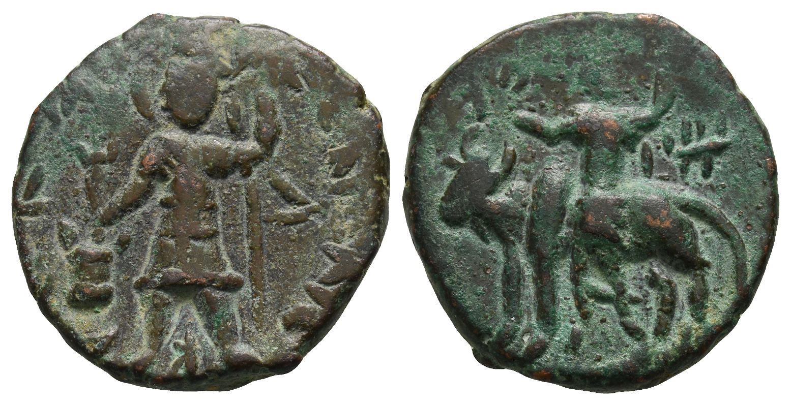 Main mint in Kapisha (Begram?). Middle phase. Vasudeva, nimbate, helmeted, and diademed, standing facing, head to left, sacrificing over altar and holding trident; to left, trident with additional crossbar / Ithyphallic Siva standing facing, holding garland or diadem and trident; behind, the bull Nandi standing to left; tamgha to right. MK 1000; ANS Kushan 1103-5; Donum Burns 481-5. 9.79gr, 24mm, 12h.