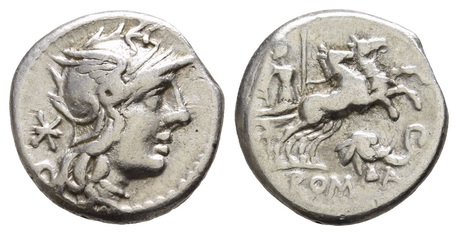 Helmeted head of Roma to right; mark of value behind / Pax driving galloping biga to right, holding olive branch, sceptre, and reins; elephant's head wearing bell and ROMA below. Crawford 262/1; BMCRR Rome 1044; RSC Caecilia 38. 3.87gr, 17mm, 9h.
