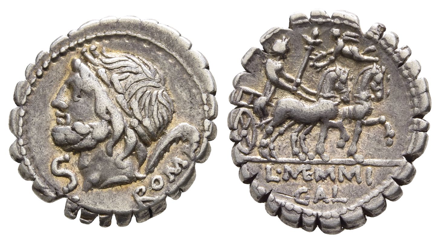 L. Memmius Galeria AR Serrate Denarius. 106 BC. Rome mint.