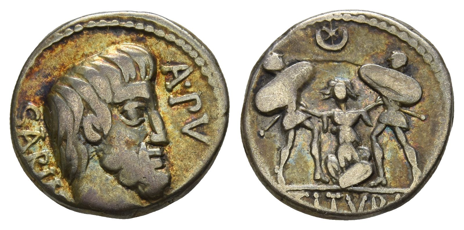 Rome mint. Bearded head of the Sabine king Tatius to right; SABIN downwards behind, [palm branch beneath chin], A • PV before / Tarpeia buried to waist in shields, thrusting off two soldiers about to cast their shields at her; star in crescent above, [L •] TITVRI in exergue. Crawford 344/2c; BMCRR Rome 2326; RSC Tituria 5. 3.78gr, 17mm, 8h