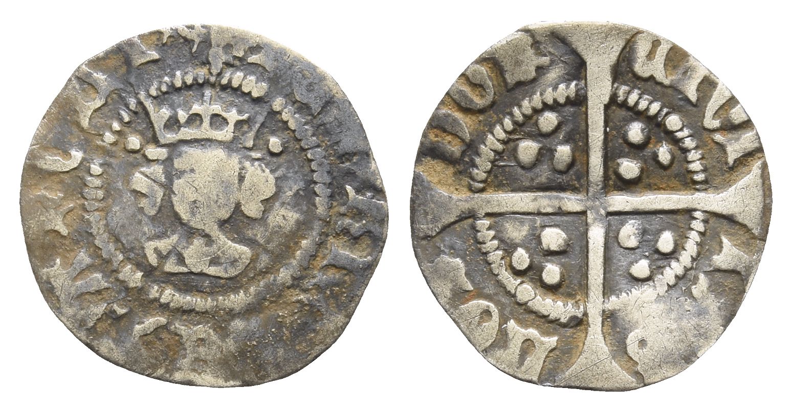 (Cross fleurée?) ꞂЄn ˣ RIC RЄX ˣ AnGLI ˣ, crowned facing bust; pellets flanking crown, leaf on breast / CIVI-TAS LOn-DOn, long cross pattée; triple pellets in quarters. Cf. North 1512; SCBC 1928. 0.42gr, 14mm, 2h.