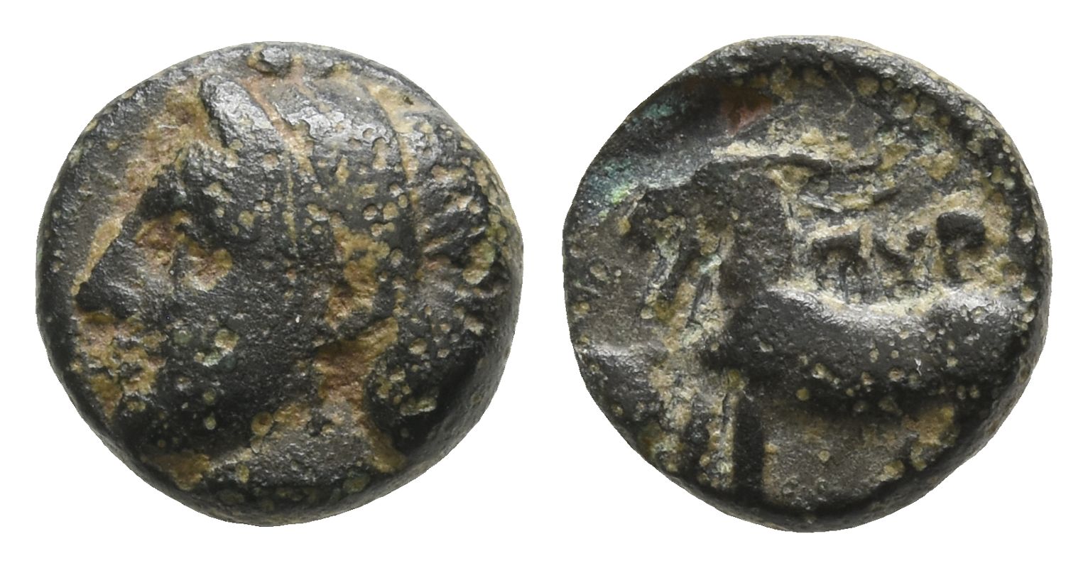 Female head (Aphrodite or nymph Pyrrha?) to left, hair bound in sphendone / ΠΥP, goat standing to left; to left, scallop shell. BMC 1-2 var. (no symbol); HGC 6, 1060; SNG Copenhagen 428. 1.37gr, 10mm, 1h.