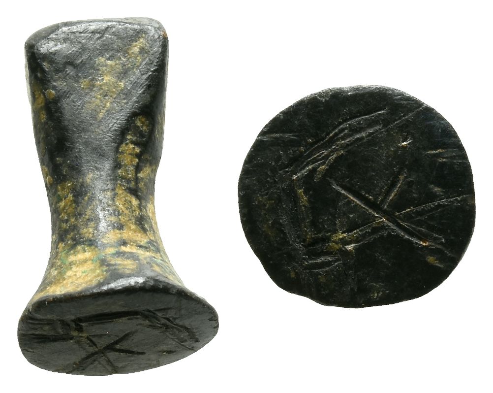Cubical bronze weight with flat round base inscribed uncertain letters. Cf. Hendin, Ancient Scale and Weights, 120 (4 Shekel). 3.15gr, 14mm x 9mm.