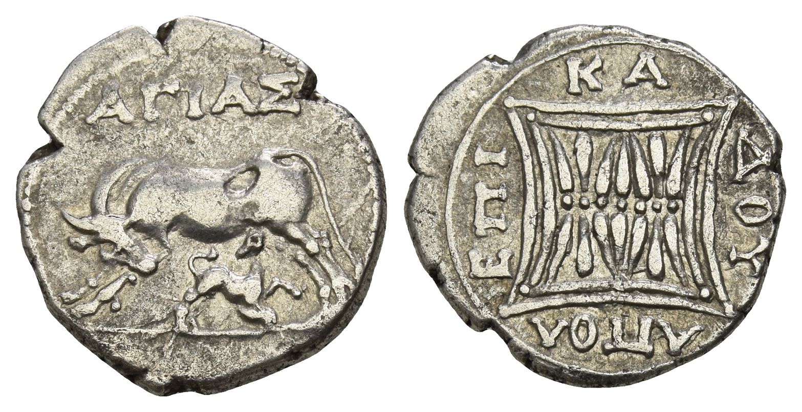 ΑΓΙΑΣ (Agias) and ΕΠΙΚΑΔΗΣ (Epikades), magistrates. Cow standing to left, head reverted, suckling calf; AΓIAΣ above / Double stellate pattern in double linear quadrangle; EΠI-KA-ΔOY AΠOΛ around. P&G 69; Ceka 3; Maier 38; HGC 3, 4. 3,47gr, 17mm, 12h.