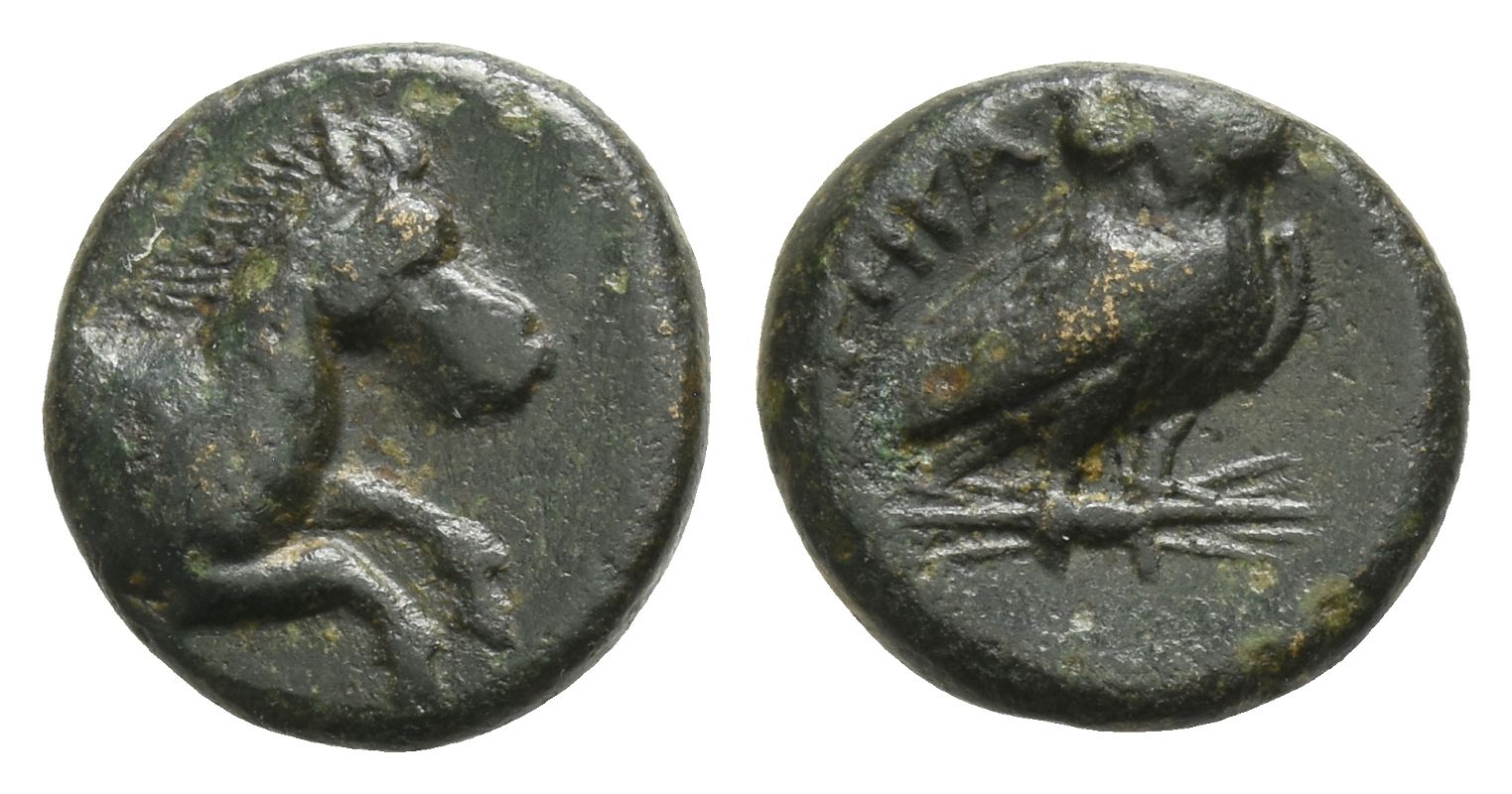 Forepart of horse galloping to right / Owl standing to right on thunderbolt, head facing; ͰΗΡA to left. HN Italy 1439; HGC 1, 1016. 1.83gr, 12mm, 9h.