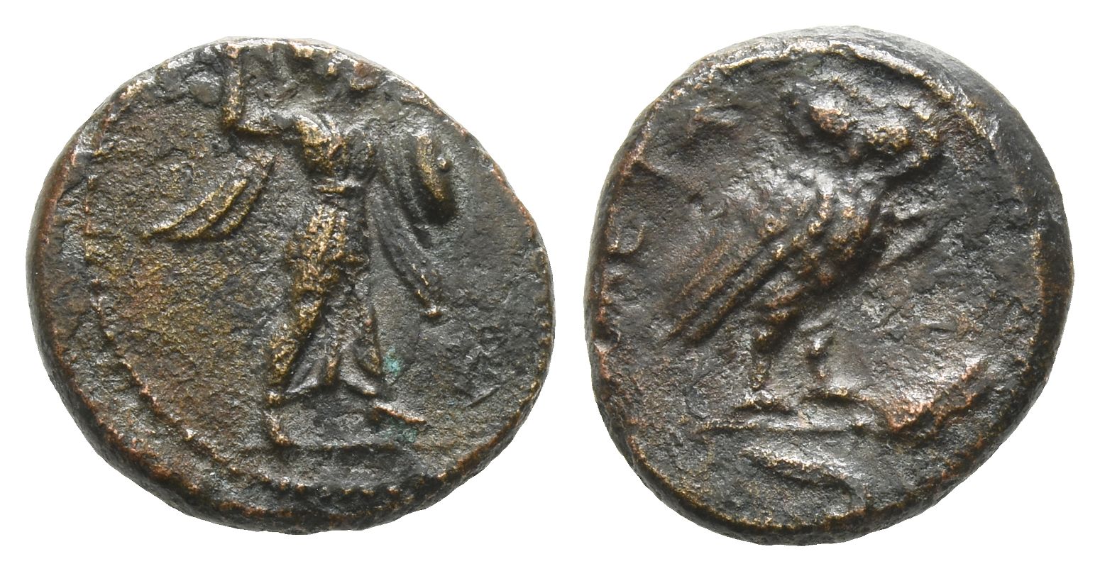Athena Promachos advancing to right, brandishing spear and shield / Owl standing on grain ear to right, head facing; META upwards to left. Johnston, Bronze 68a; SNG Copenhagen 1254; HN Italy 1704; HGC 1, 1113. 3.08gr, 15mm, 2h.