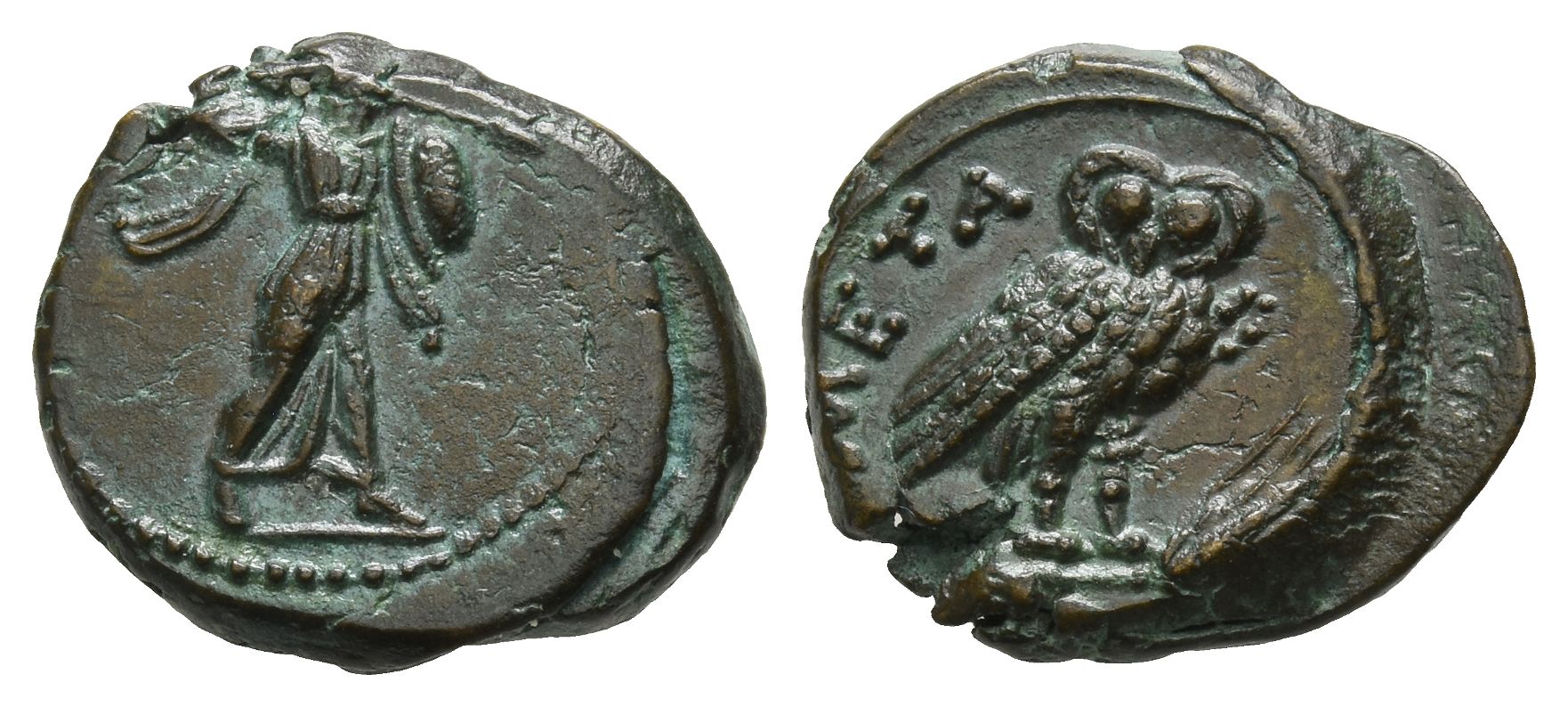 Athena Promachos advancing to right, brandishing spear and shield / Owl standing on grain ear to right, head facing; META upwards to left. Johnston, Bronze 68a; SNG Copenhagen 1254; HN Italy 1704; HGC 1, 1113. 3.44g, 17mm, 6h.