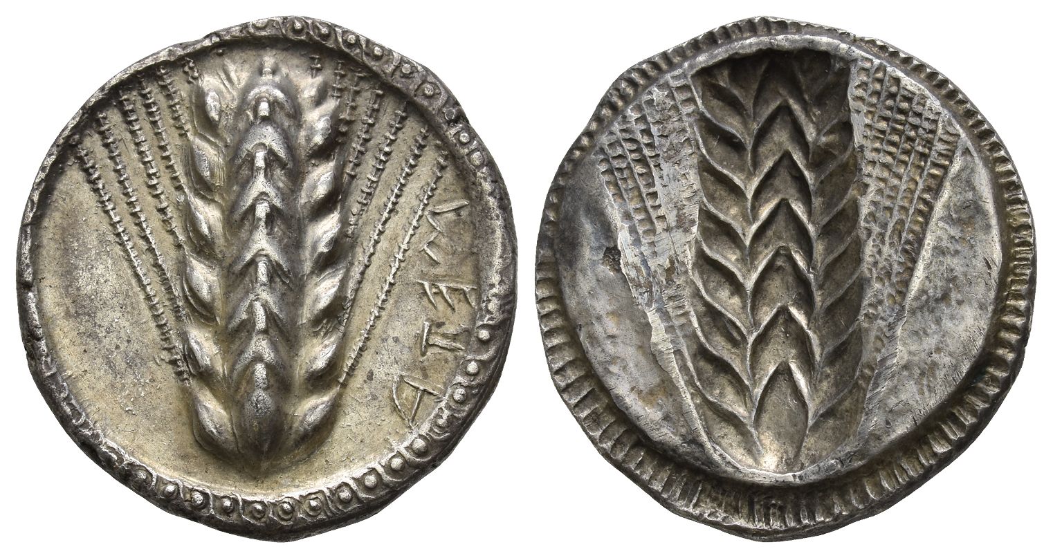 Ear of barley with seven grains; META retrograde downwards to right; all within cable border / Incuse ear of barley with eight grains. Cf. Noe Class IX, 193; HN Italy 1482. 8.11gr, 24mm, 12h.