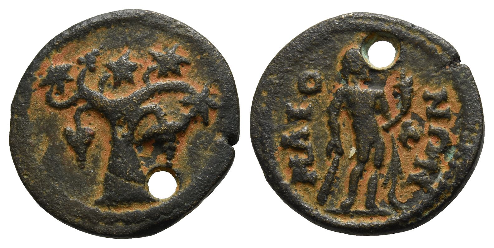 Pseudo-autonomous issue. Branching vine with large trunk and two grape bunches / MAIO-NΩN, Hercules standing facing, head to right, holding cornucopia and lion skin with his right hand, and leaning his left on club. RPC IX -; GRPC Lydia, 72; SNG Hunterian 1989. 3.49gr, 19mm, 6h.