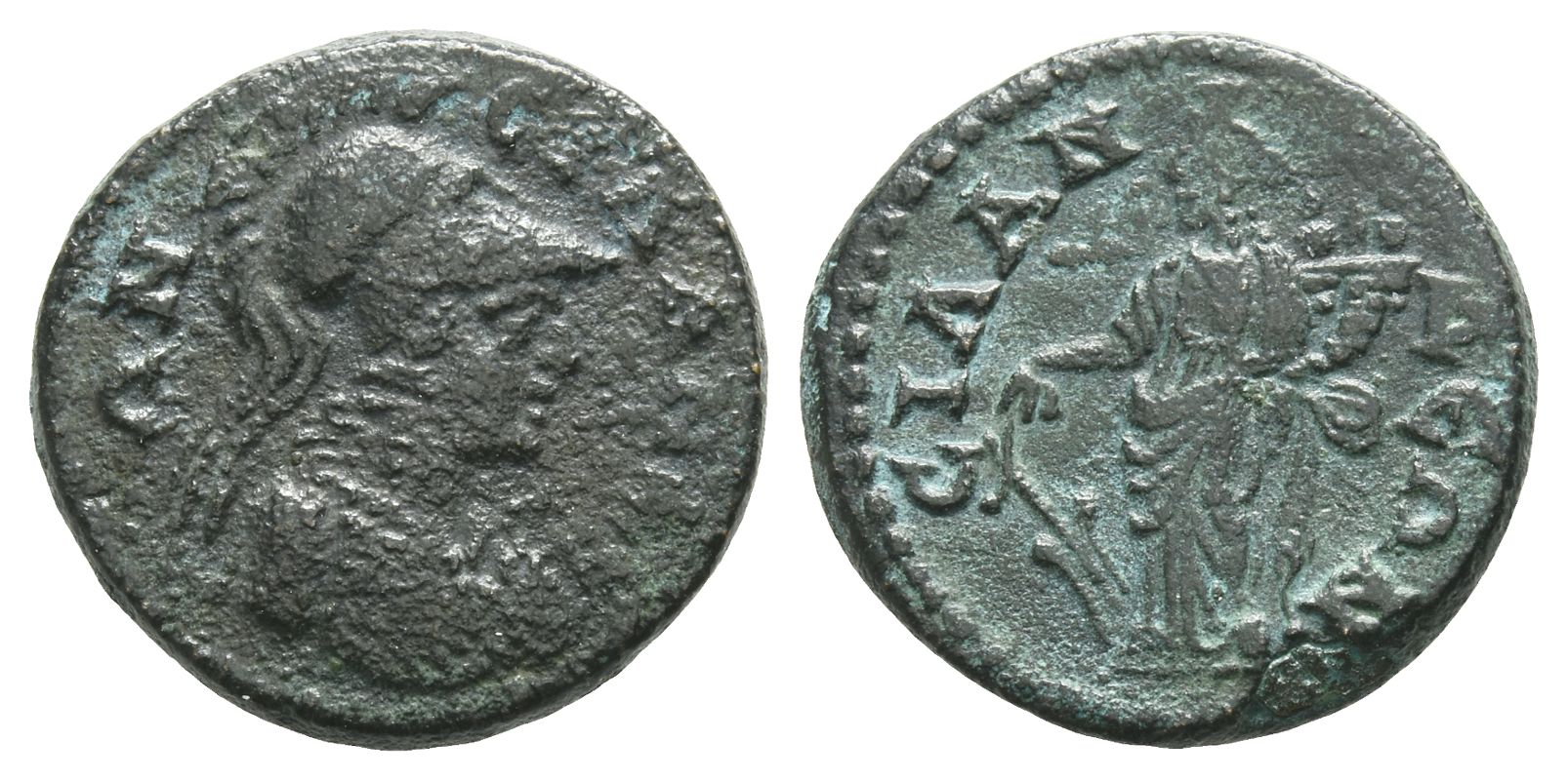 CIΛANΔЄΩN, helmetted and cuirassed bust of Athena to right, wearing aegis / CIΛANΔЄΩN, Tyche standing to left, holding rudder and cornucopia. RPC V.2 Unassigned ID 76882; GRPC Lydia 18. 3.90gr, 18mm, 6h.