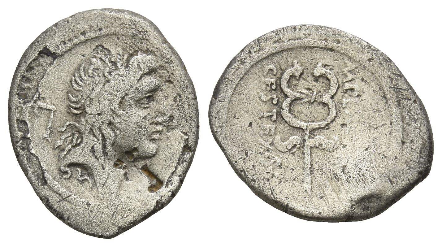 Male head to right, with flowing hair; hook(?) behind / Winged caduceus; M PLA[ETORI] to left, CEST EX • S • C to right. Crawford 405/5; cf. BMCRR Rome 3565. 3.58gr, 20mm, 2h.