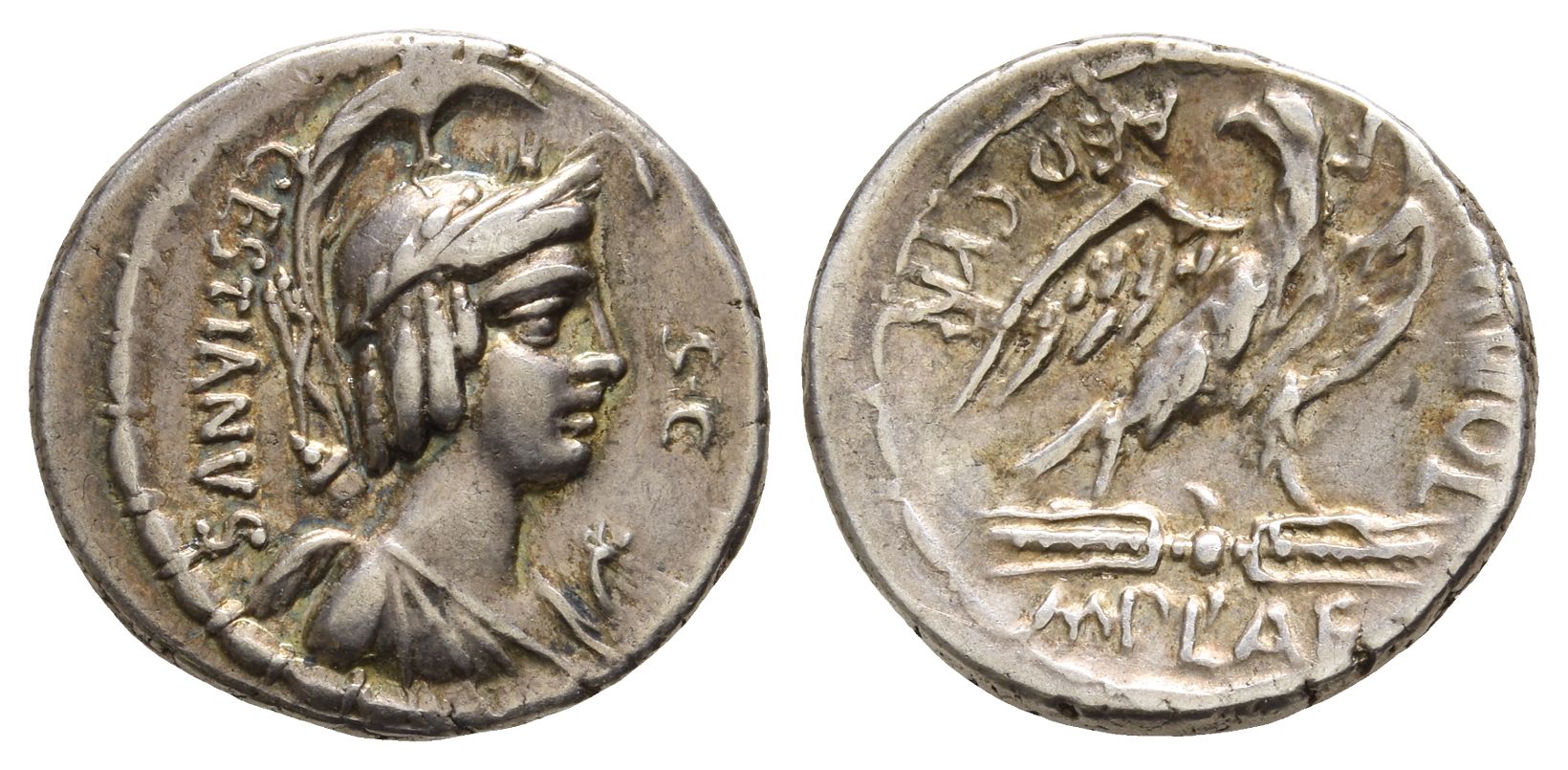 Bust of 'Vacuna' to right, wearing wreathed and crested helmet, bow and quiver on shoulder; cornucopia beneath chin, CESTIANVS behind, S•C before / Eagle standing to right on thunderbolt, head to left; M•PLAE-TORIVS M•F•AED•CVR around. Crawford 409/1; BMCRR Rome 3596; RSC Plaetoria 4. 3.87gr, 19mm, 5h.