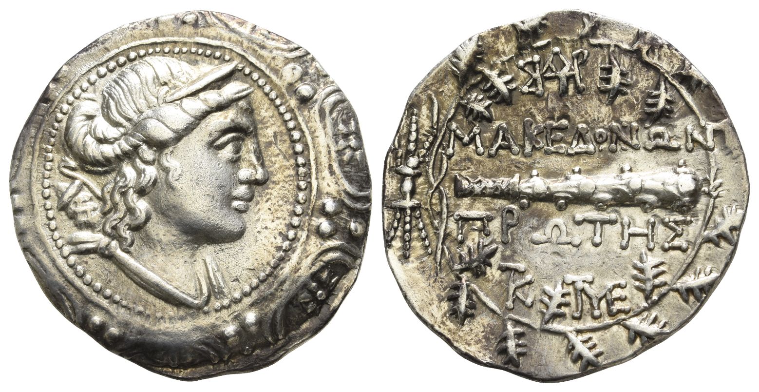 Diademed and draped bust of Artemis to right, bow and quiver over shoulder, on the boss of a Macedonian shield / Club; monogram of ΒΥΔΡ and MAKEΔONΩN above, ΠPΩTHΣ and monograms of KT and MET below; all within oak wreath, thunderbolt to left. Cf. Prokopov, Silver, Group II.A, 258 (slightly differing lower monograms); HGC 3, 1103. 16.67gr, 31mm, 12h.