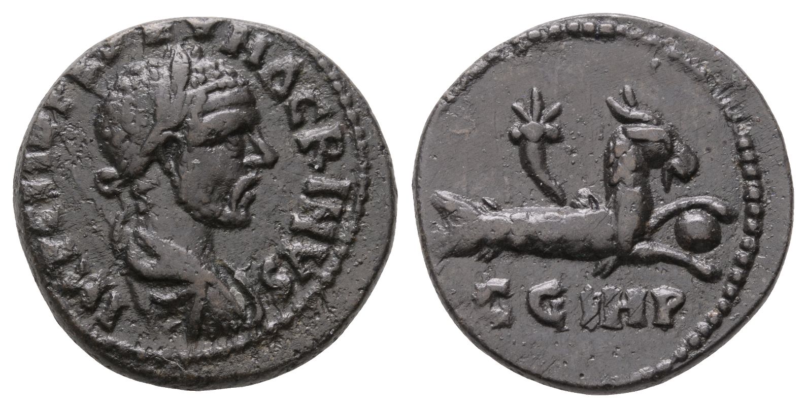 IMP C M OPE SEV MACRINVS, laureate, draped and cuirassed bust to right, seen from behind / C G I H P (Colonia Gemella Julia Hadriana Pariana), capricorn to right, bearing cornucopia on its back and with globe between its forelegs. BMC Mysia 111; SNG BnF 1502. 6.63gr, 22mm, 11h