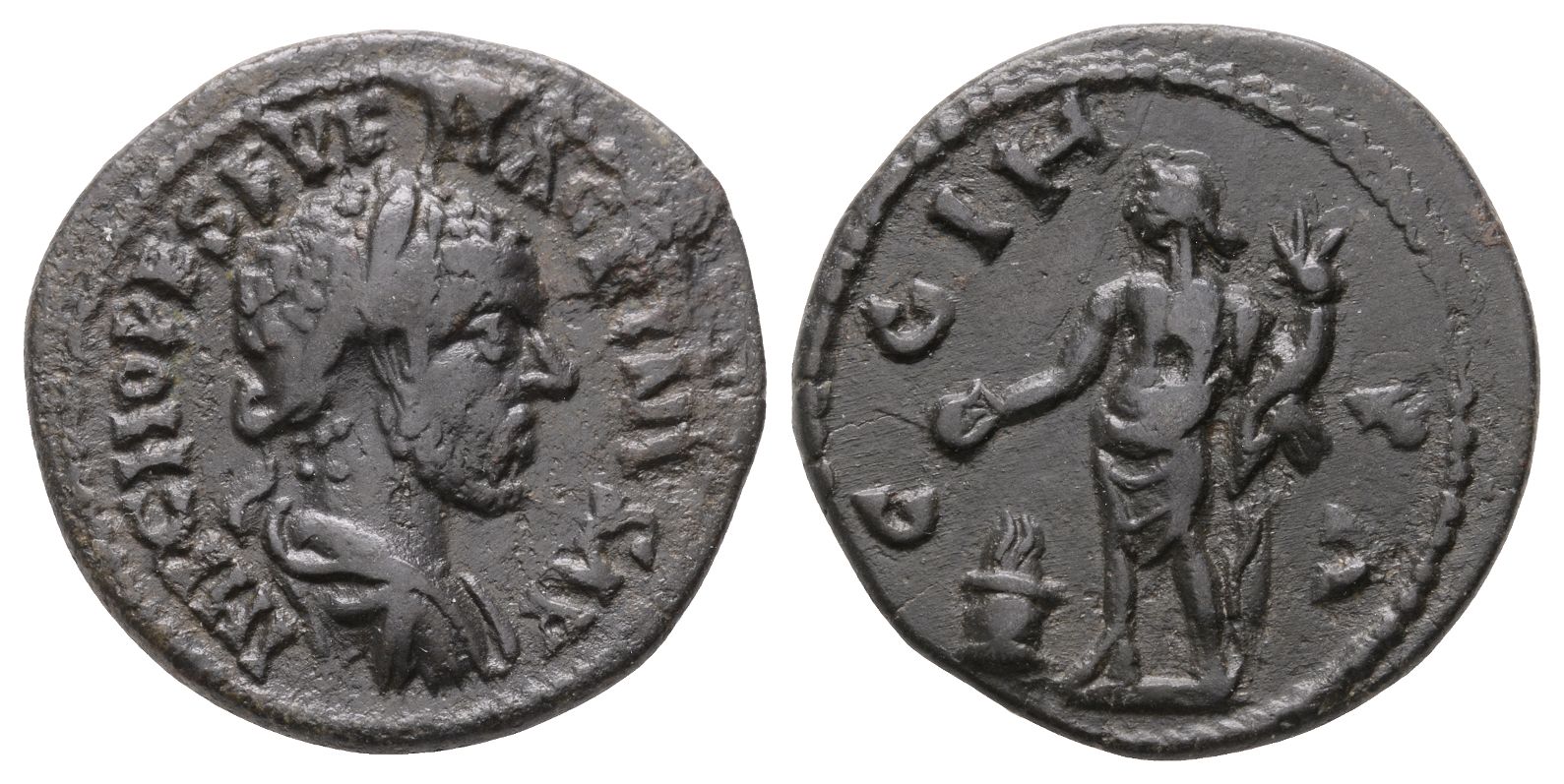 IMP C M OPE SEVE MACRINVS AV, laureate, draped and cuirassed bust to right, seen from behind / C G I H PA (Colonia Gemella Julia Hadriana Pariana), Genius standing facing, head to left, holding cornucopia with left hand and patera over lighted altar with right. Unpublished in the standard references, including BMC, SNG BnF, SNG von Aulock and Copenhagen. 5.95gr, 23mm, 2h