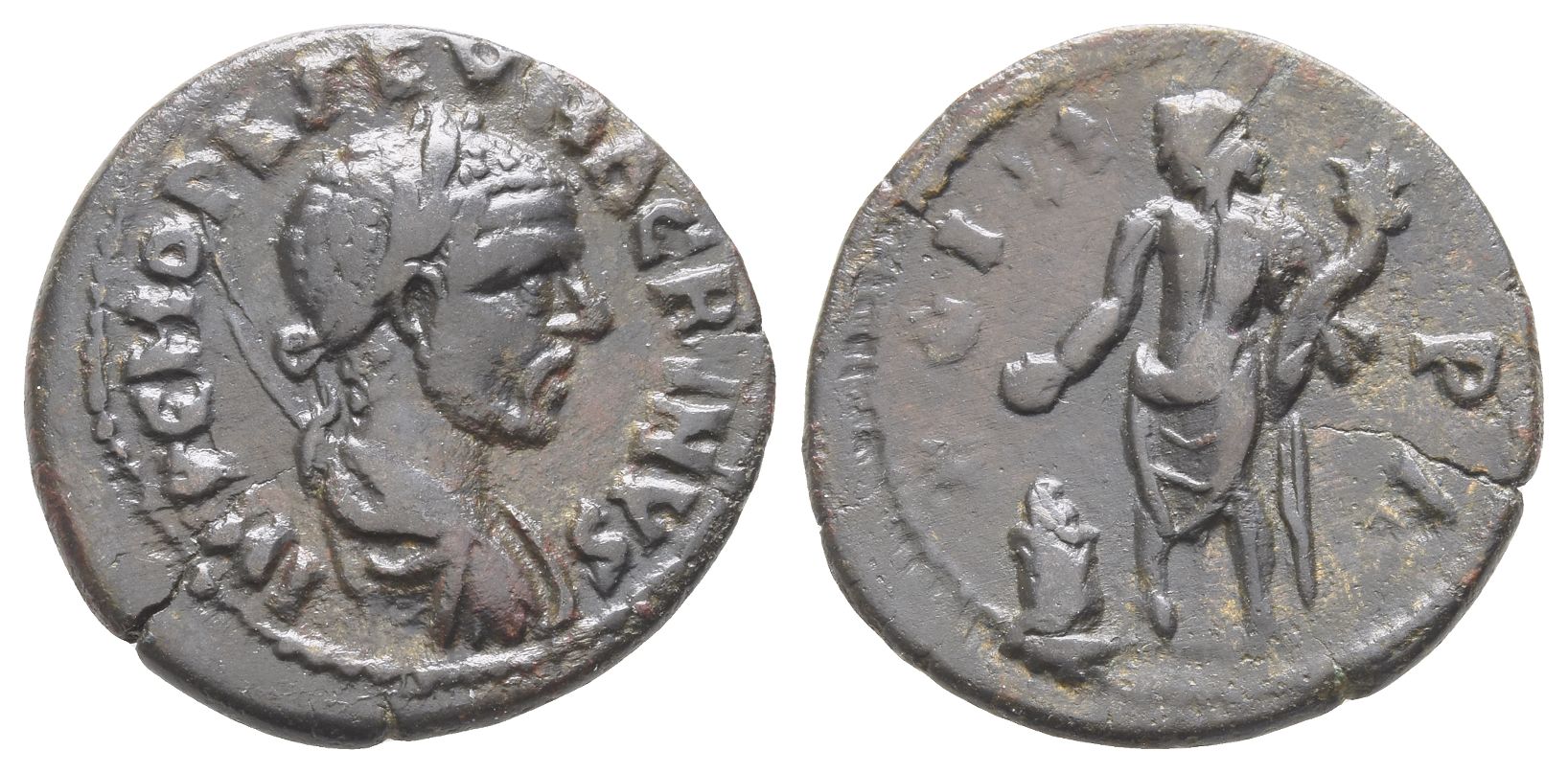 IMP C M OPE SEV MACRINVS, laureate, draped and cuirassed bust to right, seen from behind / C G I H PA (Colonia Gemella Julia Hadriana Pariana), Genius standing facing, head to left, holding cornucopia with left hand and patera over lighted altar with right. SNG BnF 1501. 5.86gr, 23mm, 1h.