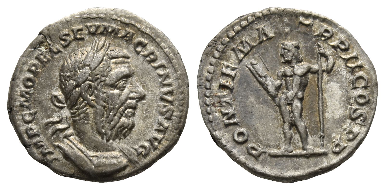 Rome mint; struck AD 217. IMP C M OPEL SEV MACRINVS AVG, laureate and cuirassed bust to right, seen from front / PONTIF MAX TR P II COS P P, Jupiter standing facing, head to left, holding thunderbolt in his right hand and long sceptre in his left. RIC IV.2 28; Cohen -. 2.96gr, 19mm, 5h.