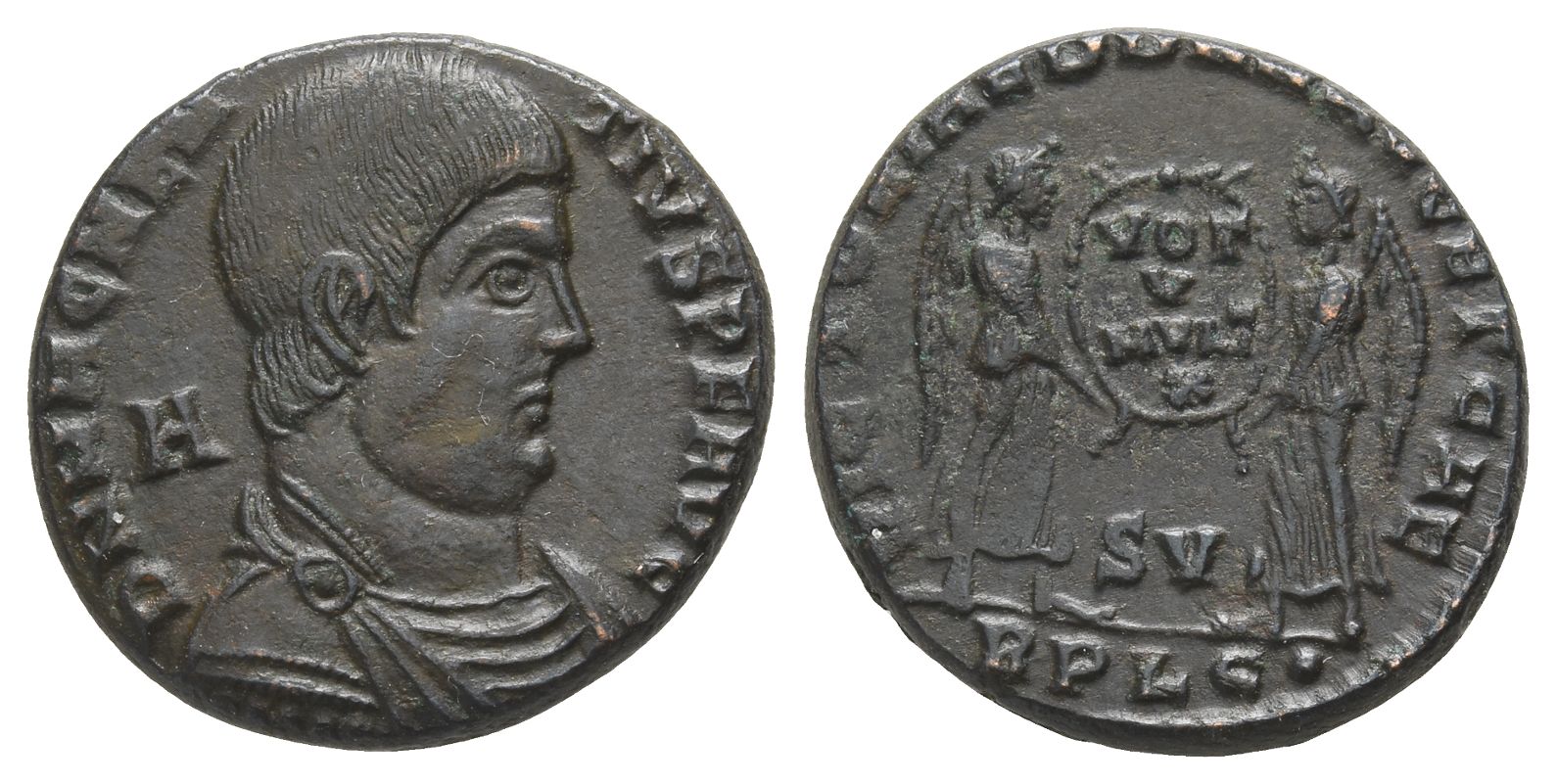 Lugdunum mint. 1st officina. D N MAGNENTIVS P F AVG, bare-headed, draped and cuirassed bust to right; A behind / VICTORIAE DD NN AVG ET CAE, two Victories standing facing one another, together holding shield inscribed VOT V MVLT X in four lines; SV below, RPLG• in exergue. RIC VIII 128. 5.67gr, 20mm, 6h