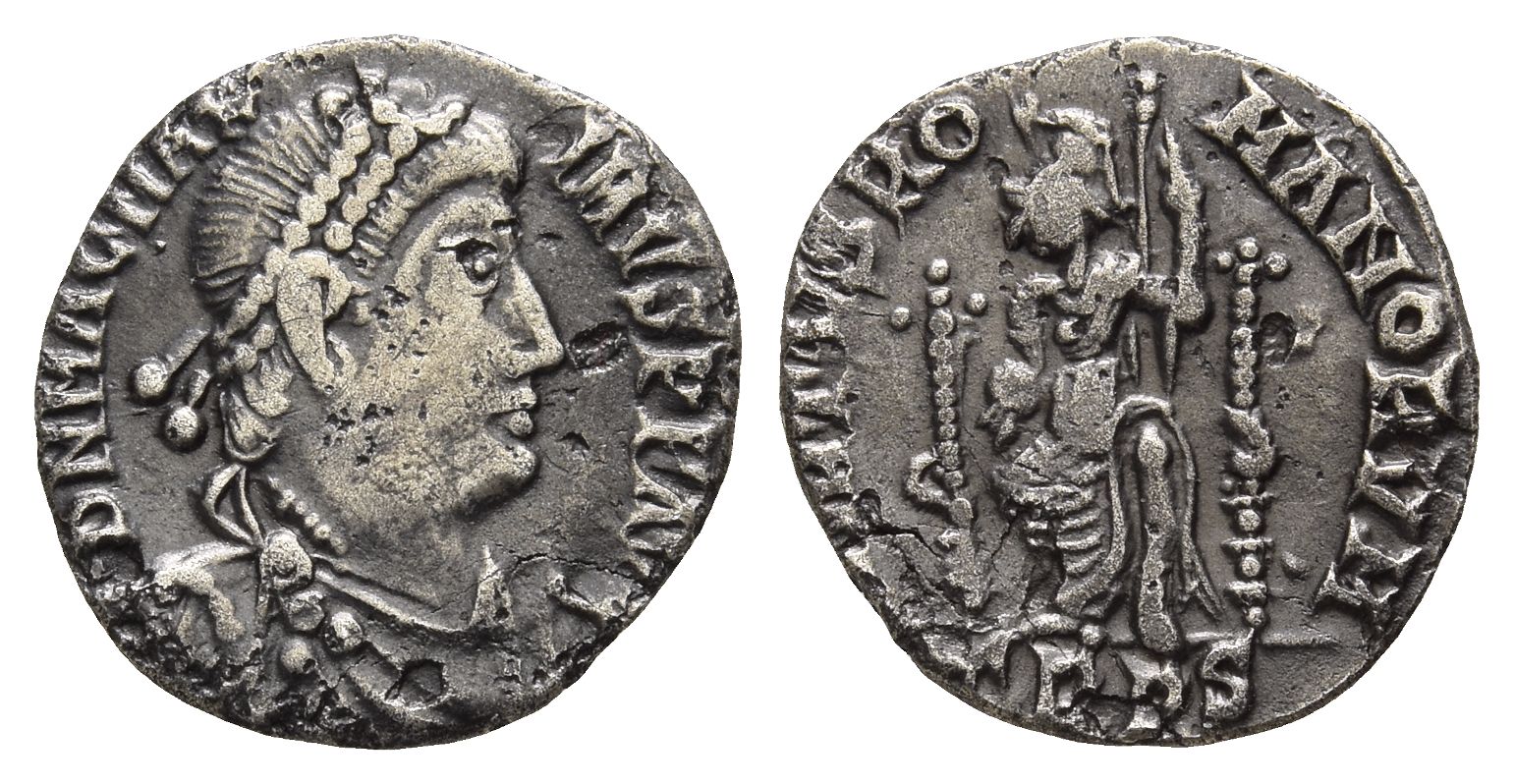 Treveri mint. D N MAG MAXIMVS P F AVG, pearl-diademed, draped and cuirassed bust to right / VIRTVS ROMANORVM, Roma enthroned facing, head to left, holding globe and spear, TRPS in exergue. RIC 84b; RSC 20a. 1.50gr, 16mm, 12h