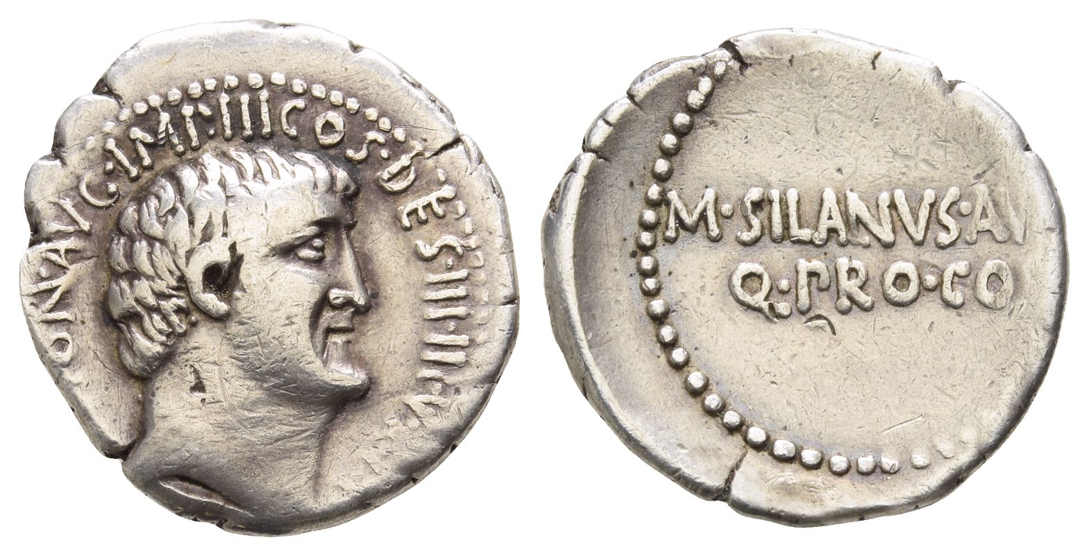 [AN]TON • AVG • IMP • III COS • DES • III • III • V • R • P • C, bare head of Mark Antony to right; small P (engraver's signature) in hair behind ear / M • SILANVS • AV[G] Q • PRO • CO[S] in two lines. Crawford 542/1; CRI 346; BMCRR East 175; RSC Antonia 71. 3.70gr, 20mm, 3h.