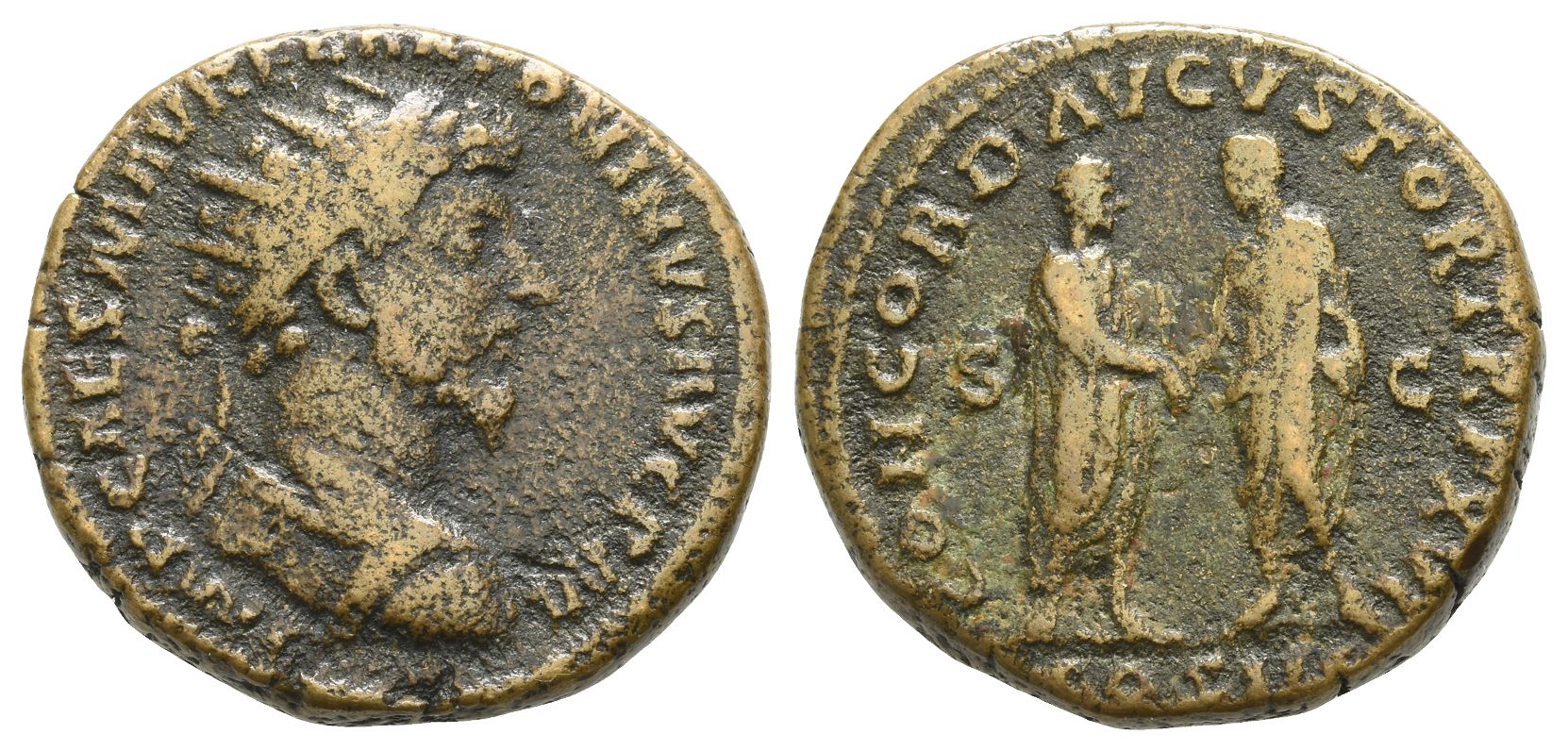 IMP CAES M AVREL ANTONINVS AVG P M, radiate and cuirassed bust to right / CONCORD AVGVSTOR TR P XVI, Marcus Aurelius and Lucius Verus standing with clasped hands; S C across fields, COS III in exergue. RIC III 829; Cohen 59. 13.82gr, 26mm, 12h.