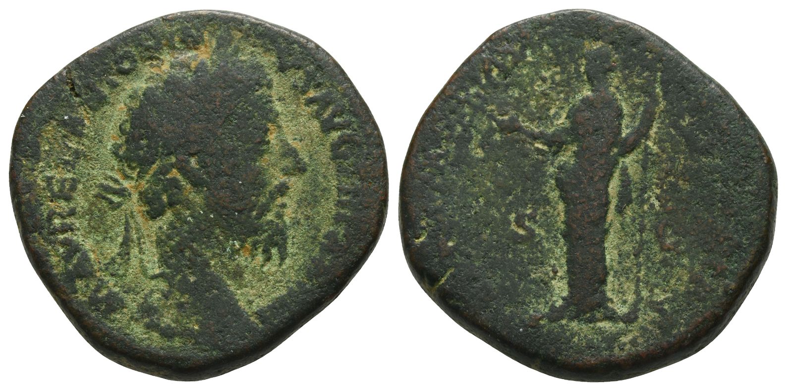 Rome mint; struck AD 179(?). M AVREL ANTONINVS AVG TR P [XXXIII?], laureate head to right / [FELICITAS AVG IMP X COS III P P?], Felicitas standing facing, head to left, holding caduceus in her right hand and long sceptre in her left; S C across fields. Cf. RIC III 1239; cf. Cohen 186; cf. BMC 1695. 27.23gr, 31mm, 6h