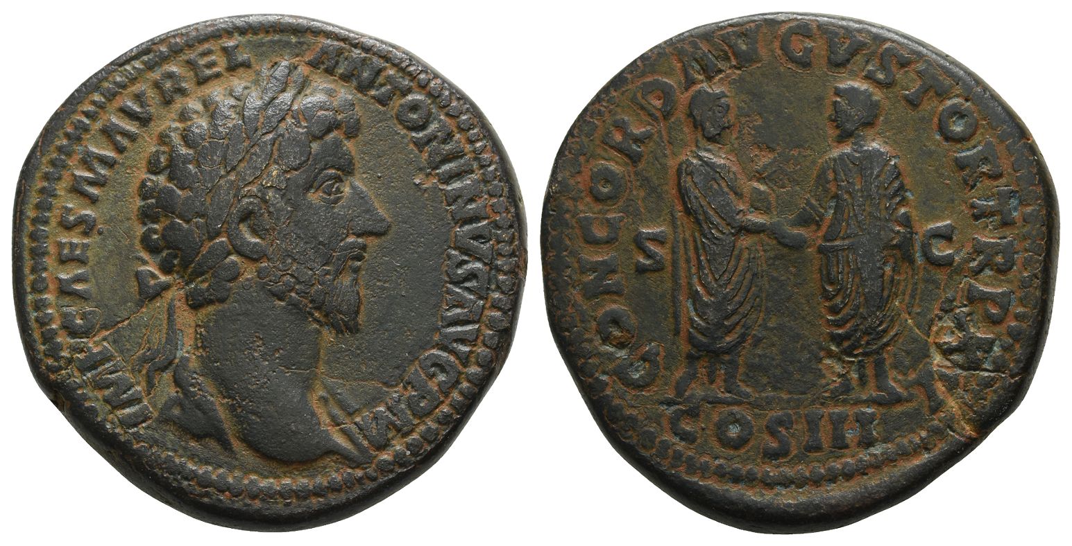 Rome mint; struck AD 161. IMP CAES M AVREL ANTONINVS AVG P M, laureate head to right, with slight drapery over shoulders / CONCORD AVGVSTOR TR P XV, Marcus Aurelius, togate, on the left, and Lucius Verus, togate, on the right, standing facing each other and clasping their right hands, each holding a scroll in his left hand; S C across fields, COS III in exergue. RIC III 795-797 var. (bust type); Cohen 45-47 var. (same). 26.55gr, 33mm, 12h.