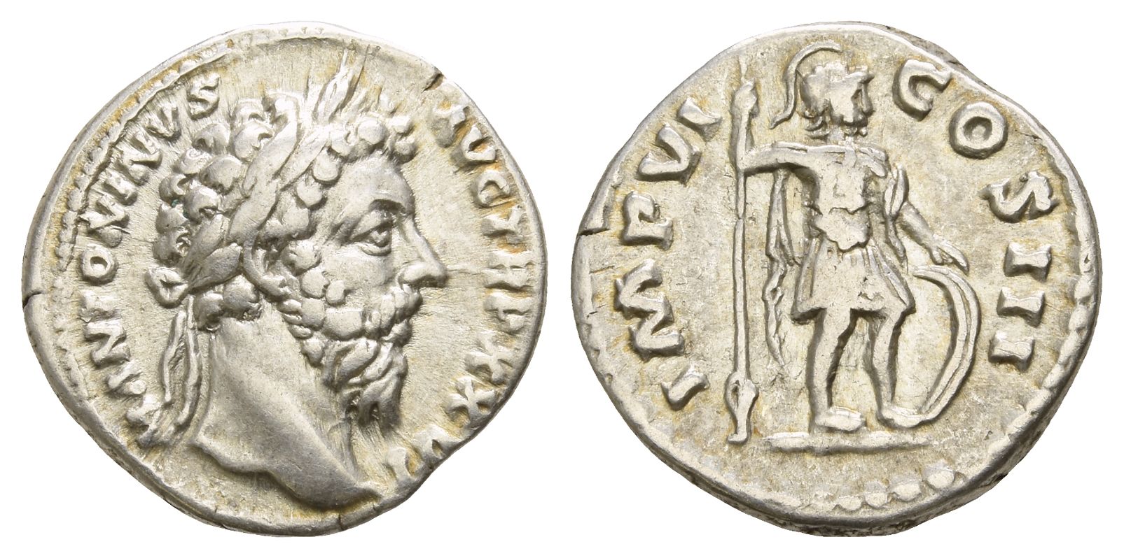 M ANTONINVS AVG TR P XXVI, laureate head to right / IMP VI COS III, Mars standing facing, head to right, holding spear and resting hand on shield set on ground. RIC III 261; BMCRE 555; RSC 290. 3.54gr, 19mm, 6h.
