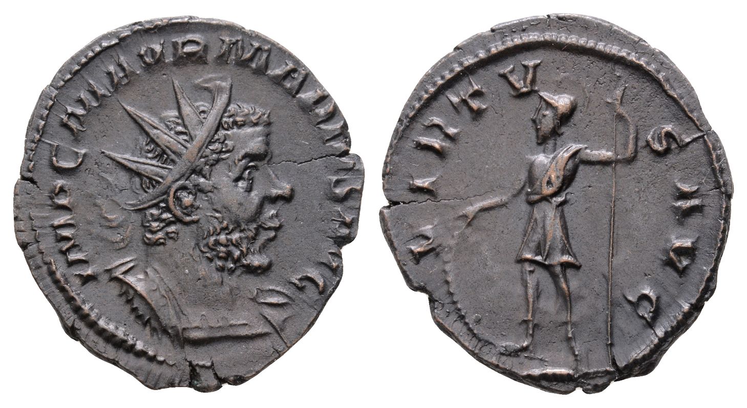Colonia Agrippinensis mint. IMP C M AVR MARIVS AVG, radiate and cuirassed bust to right / VIRTV-S AVG, soldier standing facing, head to left, leaning on shield with right hand and holding spear with left. RIC V.2 19; Cunetio 2512; Elmer 640 ('Treveri'). 2.55gr, 20mm, 1h