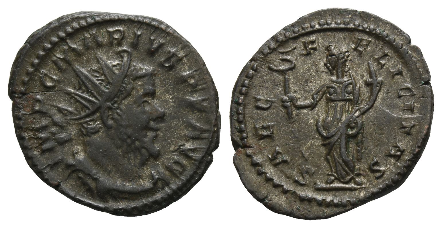 Treveri mint; struck AD spring 269. IMP C MARIVS P F AVG, radiate, draped and cuirassed bust to right / SAEC FELICITAS, Felicitas standing facing, head to left, holding caduceus and cornucopia. RIC V.2 10 (Colonia Agrippinensis); RIC V.4 485; Cohen 13 (Colonia Agrippinensis); Elmer 634. 3.11gr, 22mm, 7h.