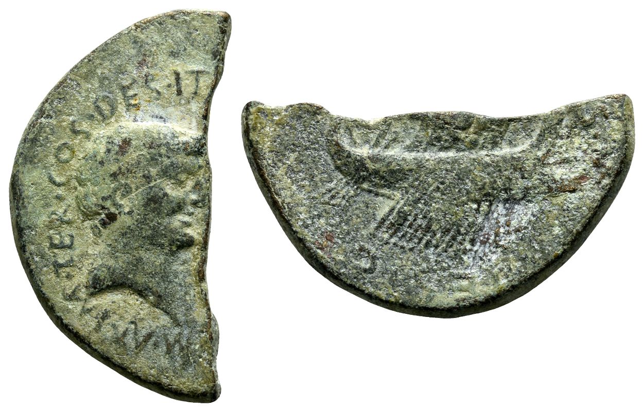 'Fleet coinage'. L. Calpurnius Bibulus, praetor designatus. M • ANT(ligate) • IMP (MP ligate) • TER • COS • DES • IT[ER • ET • TER • III • VIR • R • P • C •], bare head of Antony to right [vis à vis bare head of Octavia to left] / [L BIBVLV]S • M • F • PR • DESIG, two galleys sailing to right; [caps of the Dioscuri above]; below, B (denomination mark). RPC I 4090; M. Amandry, "Le monnayage en bronze de Bibulus, Atratinus et Capito," SNR 65 (1986), pg. 78-79. 9.33gr, 34mm, 9h.