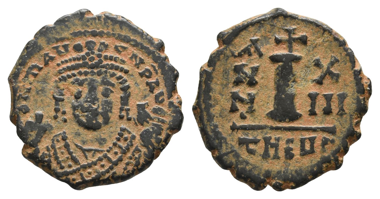Theoupolis (Antioch) mint. Dated RY 13 (AD 594/5). ∂ N ᙏAЧ CN P AЧ, bust facing, wearing crown with trefoil ornament and consular robes, holding mappa and eagle-tipped sceptre / Large I, surmounted by cross; ANN• in left field, XIII in right field, τHЄUP' in exergue. MIB 102; DOC 206; SB 537. 2,43gr, 17mm, 6h.