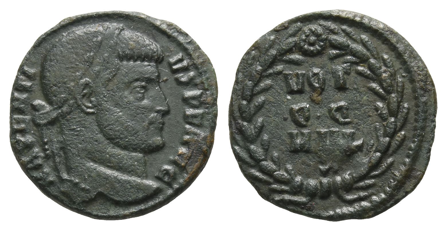 Rome mint; struck AD 310-312. MAXENTI-VS P F AVG, laureate head to right / VOT • Q • Q MVL X, legend in four lines within wreath. RIC VI 281a. 2.10gr, 16mm, 6h.